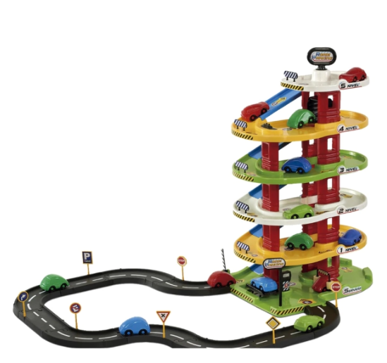 Garage súper completo de 5 niveles a pura diversión. Cuenta con elevador de reparaciones, lava autos, bomba de gasolina, ascensor y pista con señales de tránsito, para que puedas hacer varias configuraciones. Incluye 2 autos.